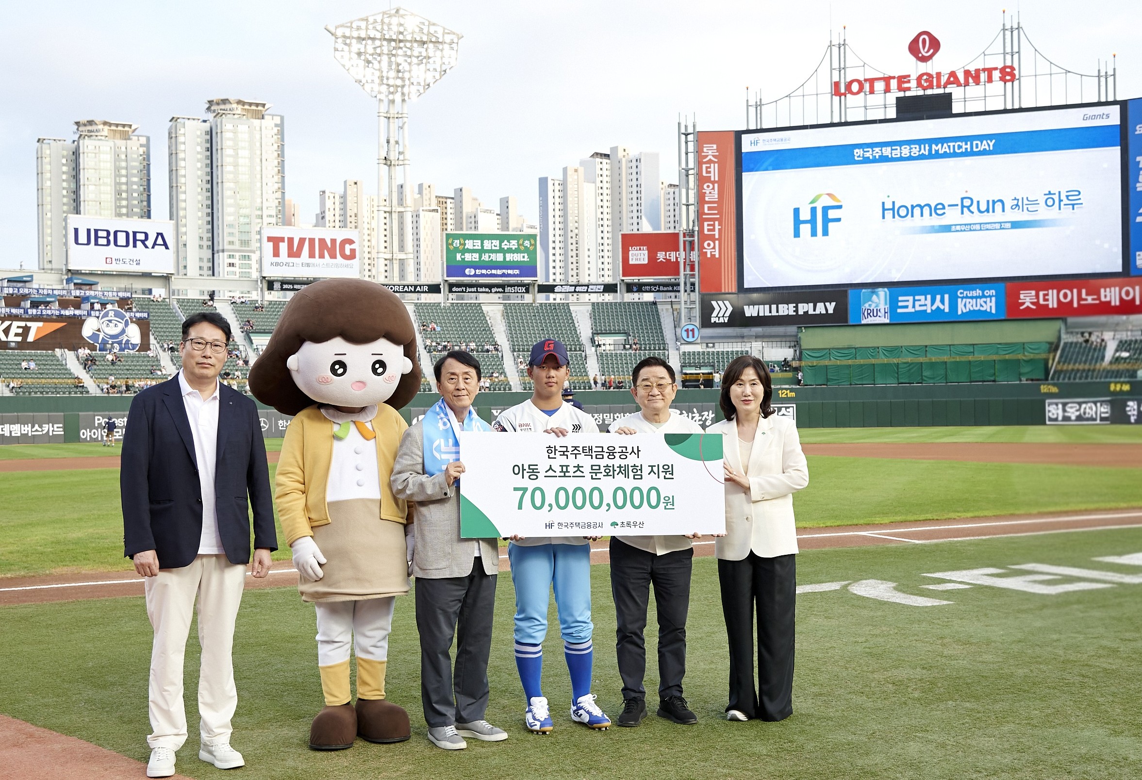 On August 27, Korea Housing Finance Corporation (HF) held a donation ceremony at Sajik Baseball Stadium in Dongnae-gu, Busan, to support local children’s access to sports and cultural experiences. Pictured from left to right : HF Director Yoo Ho-Jae, HF mascot Jooha, HF CEO Kim Kyung-Hwan, scholarship recipient Park Ji-Hoon, ChildFund Korea Ambassador Lee Hong-Ryul, and ChildFund Korea Busan Regional Office Director Lee Soo-Kyung.