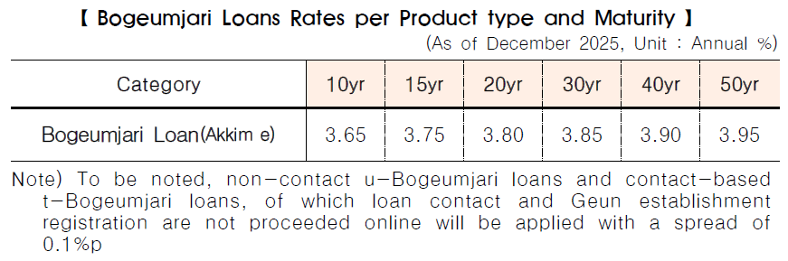 ㅇ Accordingly, the interest rates of ‘Akkim-e’ Bogeumjari loans will maintain the range of 3.65%(10-year maturity) and 3.95%(50-year maturity).