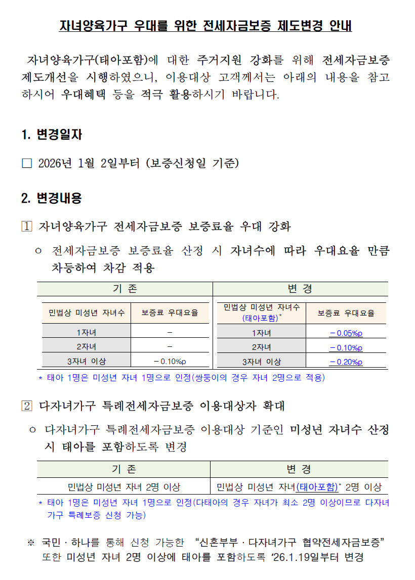 자녀양육가구 우대를 위한 전세자금보증 제도변경 안내
