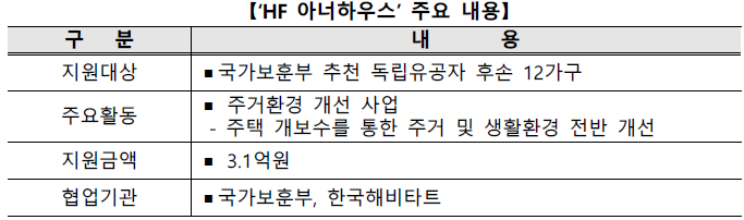 한편, 공사는 국가보훈부와 협업하여 국가유공자에게 안락한 보금자리를 선사하기 위해 2023년 6.25 참전용사 11가구, 2024년 월남 참전용사 15가구의 주거환경 개선 사업을 실시한 바 있다.