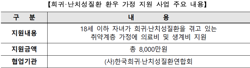 지원 대상은 18세 이하 자녀가 희귀·난치성 질환을 겪고 있는 취약계층 가정 중 (사)한국희귀·난치성질환연합회가 선정한 24가구이다.