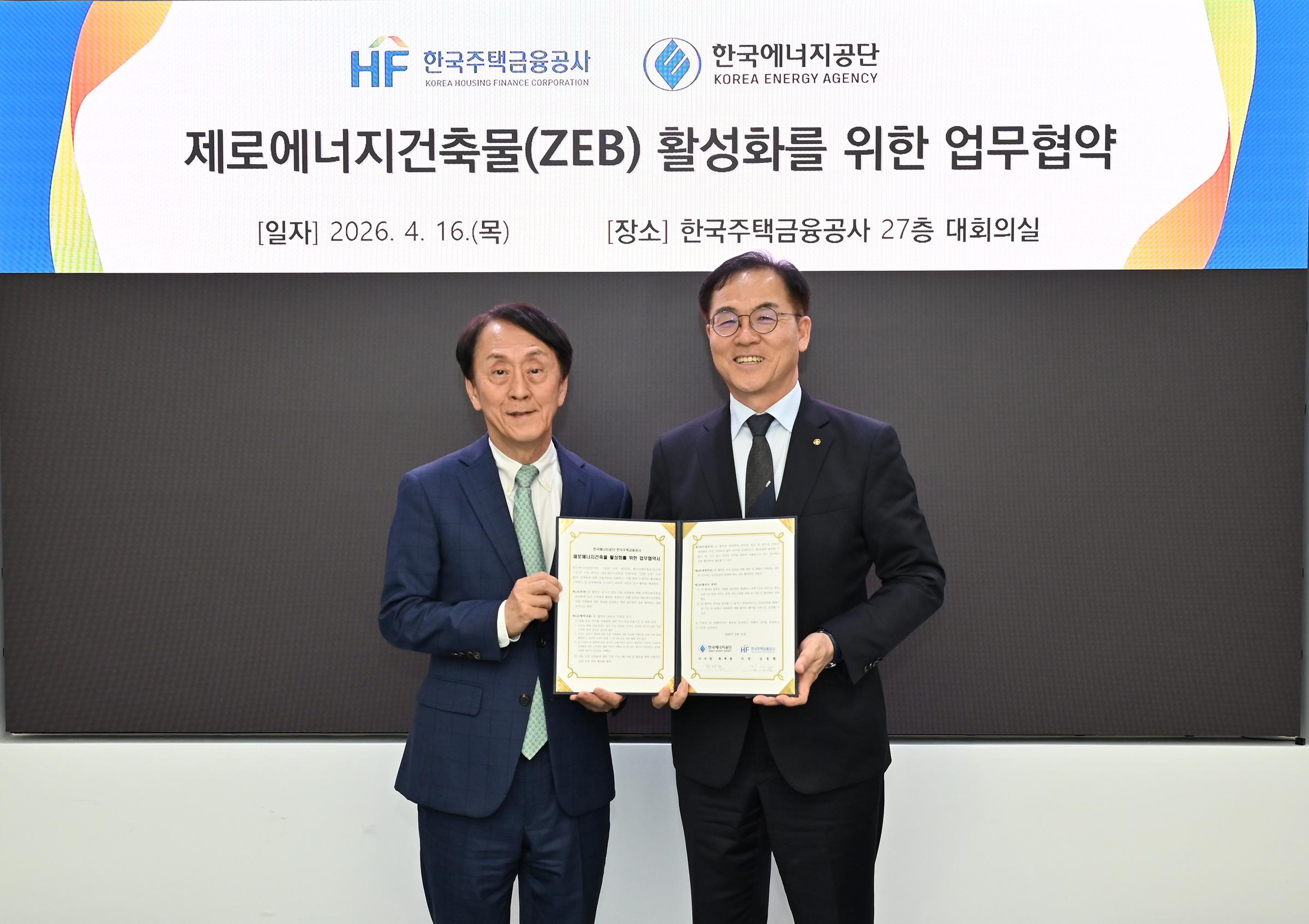 한국주택금융공사는 부산시 남구에 있는 한국주택금융공사 본사에서 한국에너지공단과 ‘제로에너지건축물(ZEB) 활성화를 위한 업무협약’을 16일 체결했다. 김경환 한국주택금융공사 사장(왼쪽)과 최재관 한국에너지공단 이사장이 협약 체결 후 기념촬영을 하고 있다.