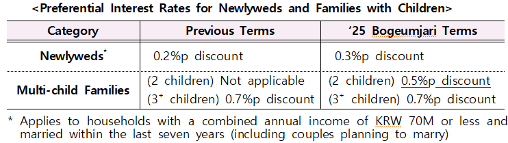 the preferential rate discount for newlywed households will increase from 0.2%p to 0.3%p, and a new 0.5%p preferential discount will be introduced for families with two children.