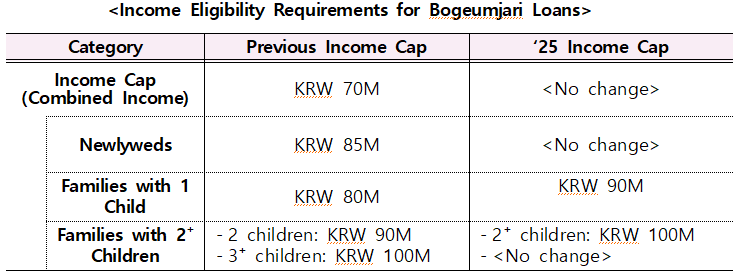 Additionally, the income eligibility requirements for households with one or two children have been relaxed by KRW 10 million each, lowering the loan application barrier for genuine homebuyers.