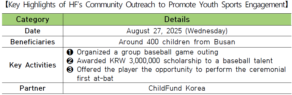 The event, held in collaboration with ChildFund Korea, was designed to offer underprivileged children in the Busan area a memorable experience at a professional baseball game and to foster a sense of connection with the local community. HF staff and university student volunteers helped approximately 400 children attend the game, while HF also awarded a KRW 3 million scholarship to a rising youth baseball talent.
