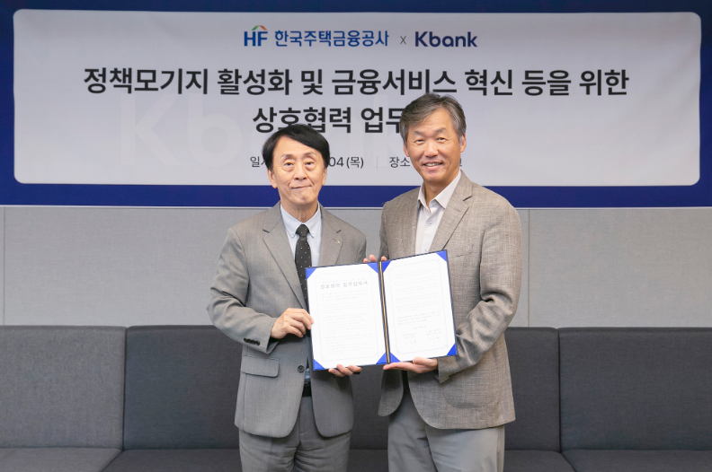 Korea Housing Finance Corporation (HF) signed a business cooperation agreement with K-Bank at the K-Bank headquarters in Jung-gu, Seoul, on September 4 to promote policy mortgage products and financial service innovation. HF CEO Kim Kyung-Hwan (left) and K-Bank CEO Choi Woo-Hyung are pictured following the signing ceremony.