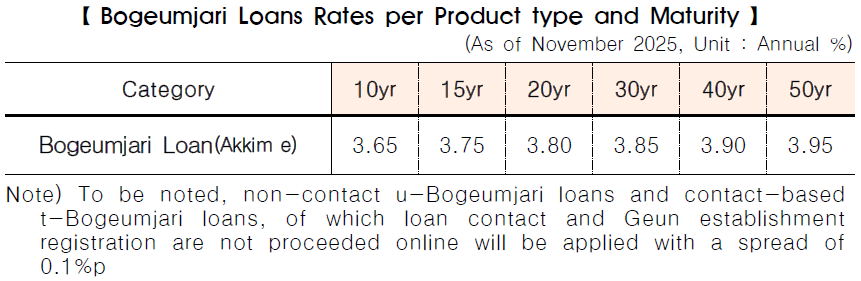 ㅇ Accordingly, the interest rates of ‘Akkim-e’ Bogeumjari loans will maintain the range of 3.65%(10-year maturity) and 3.95%(50-year maturity).
