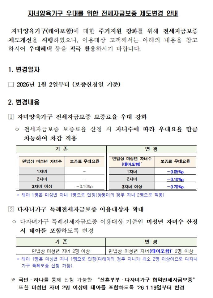 자녀양육가구 우대를 위한 전세자금보증 제도변경 안내