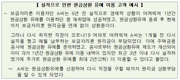 기존에는 보금자리론이나 적격대출을 이용하는 육아휴직자나 고용·산업위기지역에 거주 또는 재직하고 있는 고객에 한해 원금상환 유예를 최대 3회(회차별 1년 이내)까지 이용할 수 있었다.
