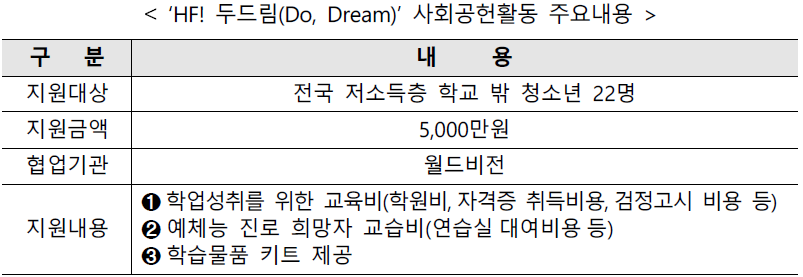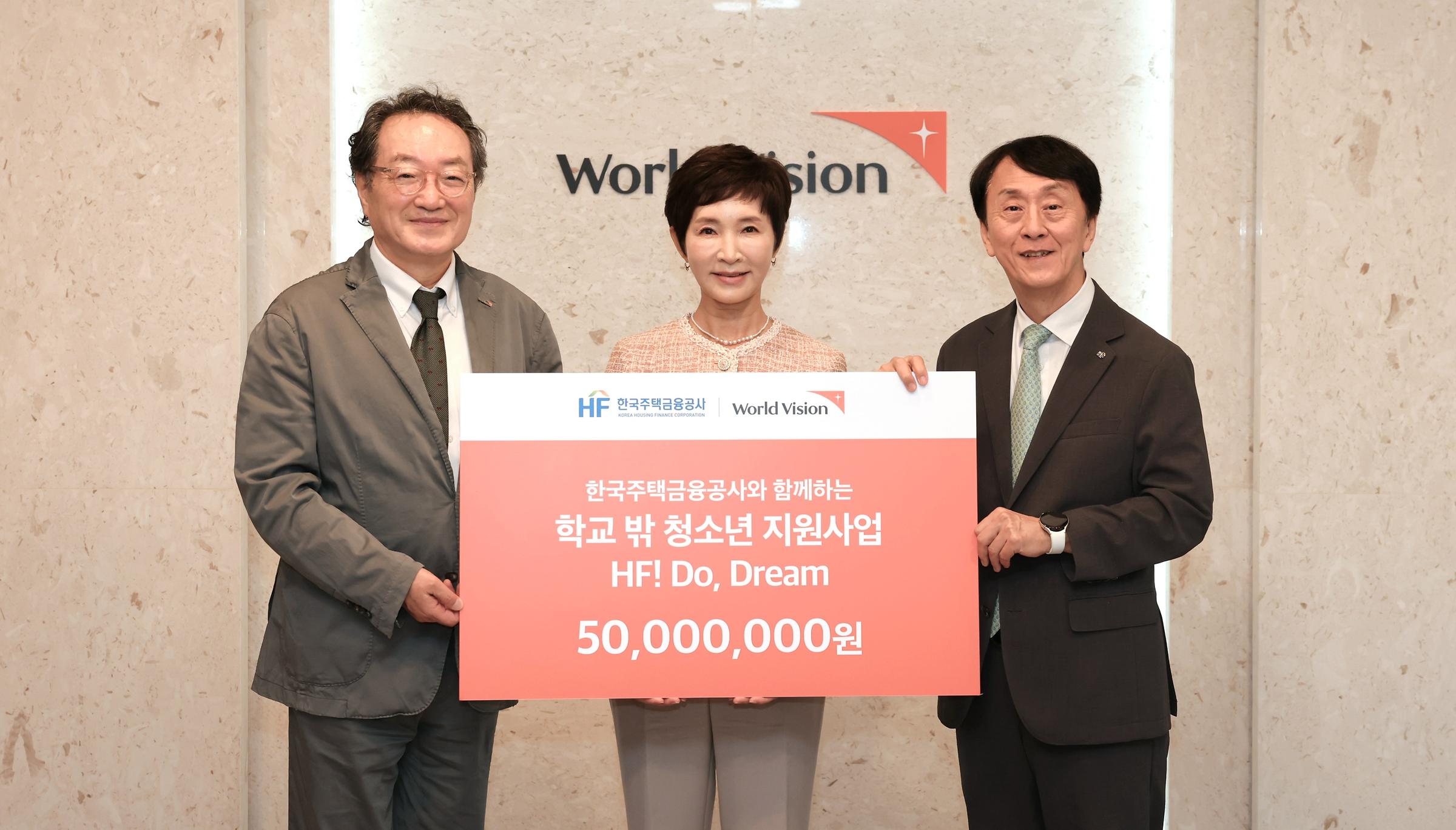 한국주택금융공사(사장 김경환)는 학교 밖 청소년*들이 꿈과 미래를 설계할 수 있도록 지원하기 위해 ‘HF! 두드림(Do, Dream)’ 사업의 기부금을 월드비전(회장 조명환)에 전달했다고 1일 밝혔다. <사진첨부>